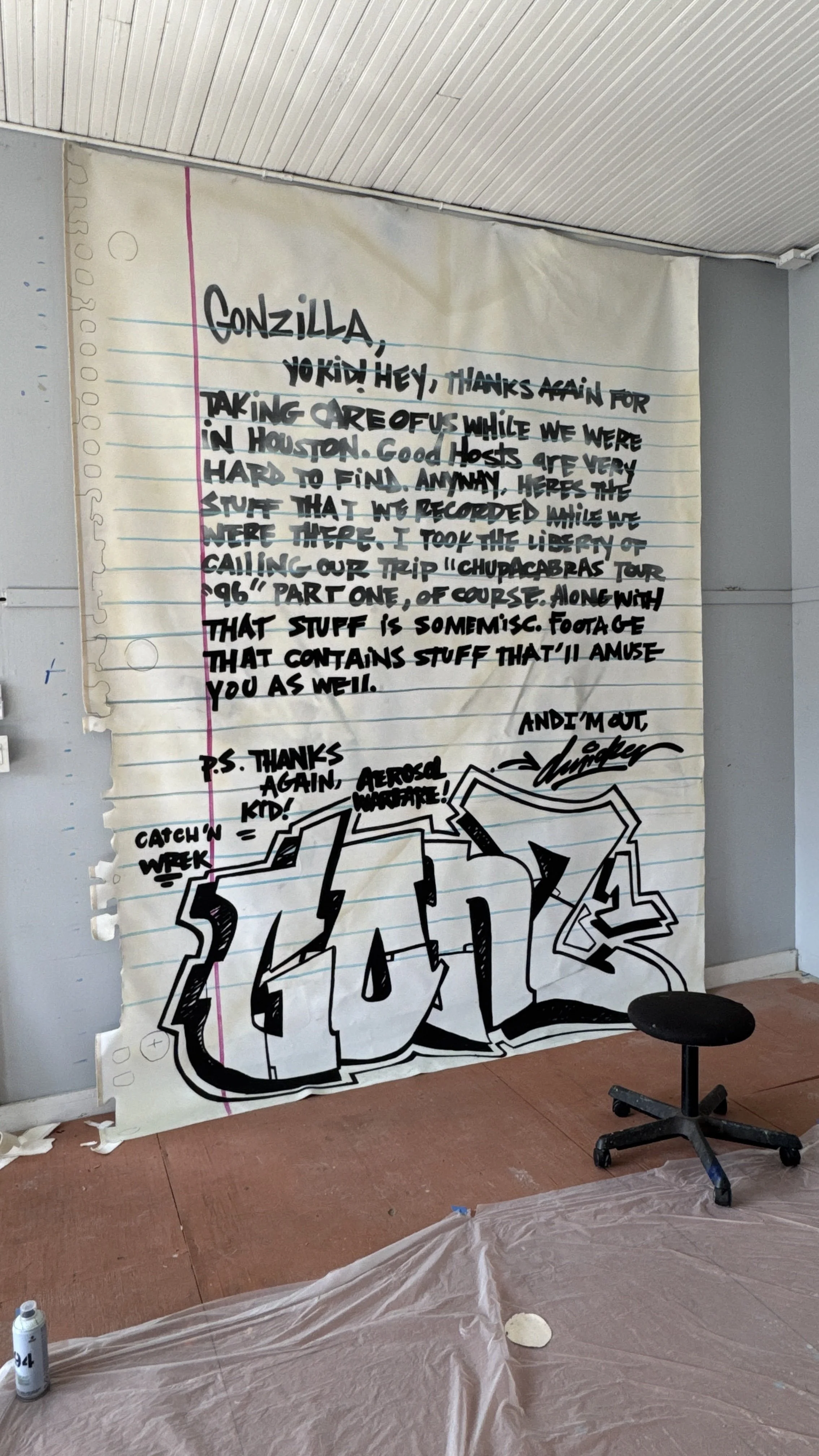 The ‘90s graffiti scene communicated via handwritten letters and zines to see what was happening in other cities. Walk through history as GONZO247 opens his underground post box to share giant-scale, hand-painted replicas of artist letters and other works from the archive of his graffiti video magazine, Aerosol Warfare.