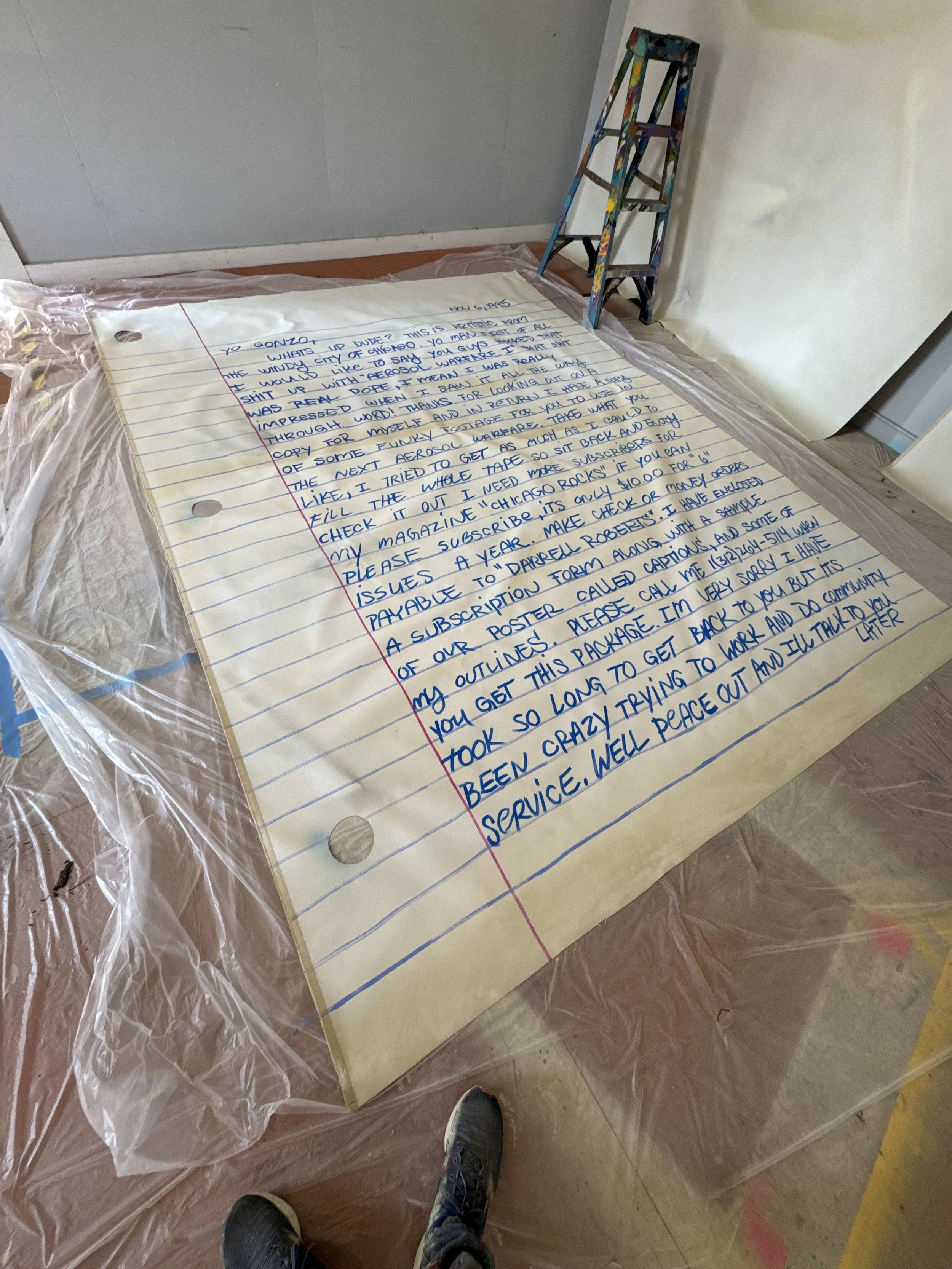 I’ve pulled together an initial selection of handwritten letters sent to me in the 1990s and recreated giant-sized hand-painted replicas of them, complete with the envelopes they traveled in and other typical goodies. The large format symbolizes these correspondences’ importance and impact on my future.